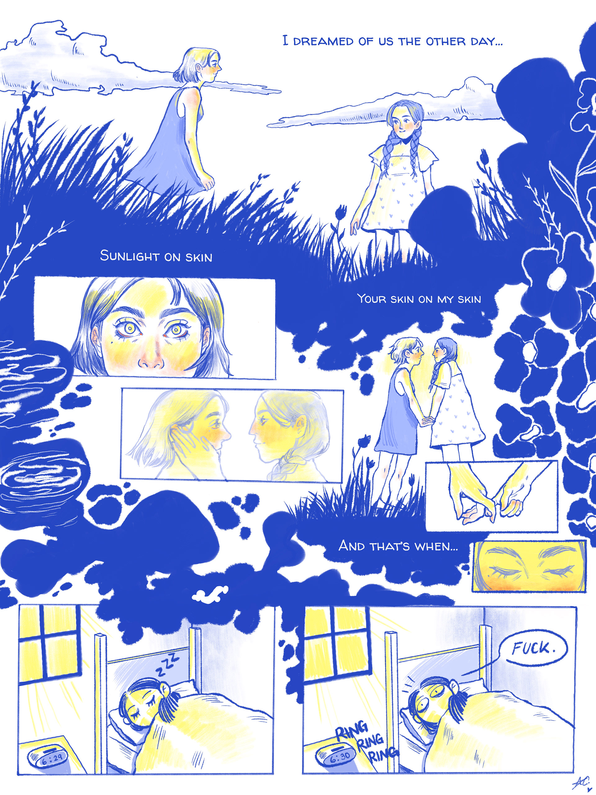 A one-page comic done for Antoine Revoy's Sequential Art class at RISD, exploring the abstraction of style and realism to convey an alternate reality.